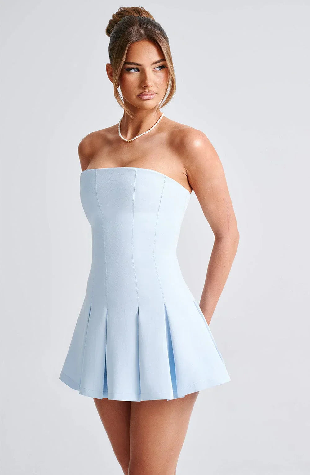 This mini IS the moment. Cut from our premium crepe fabric, Bryony has a strapless neckline and is fitted through the bust and waist for a super flattering fit. It flares gently at the skirt with box pleat detailing. Pair with cute loafers for daytime chic or heeled mules and minimal jewellery to dress her up.