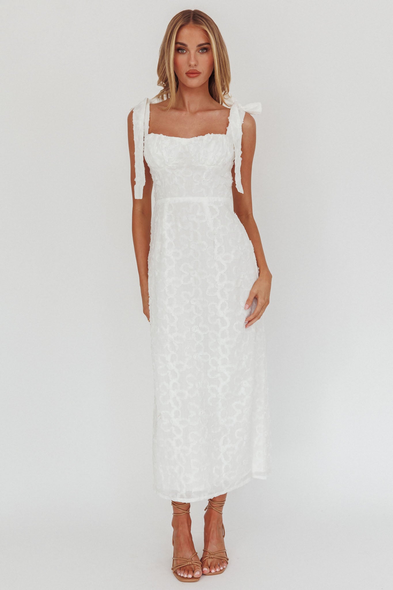 Make jaws drop in our gorgeous Cupid midi dress. Featuring an embellished fabric and pretty, tied shoulders. It's perfect for a bridal shower or special occasion teamed with tie-up heels and a satin clutch for a look we are in love with.