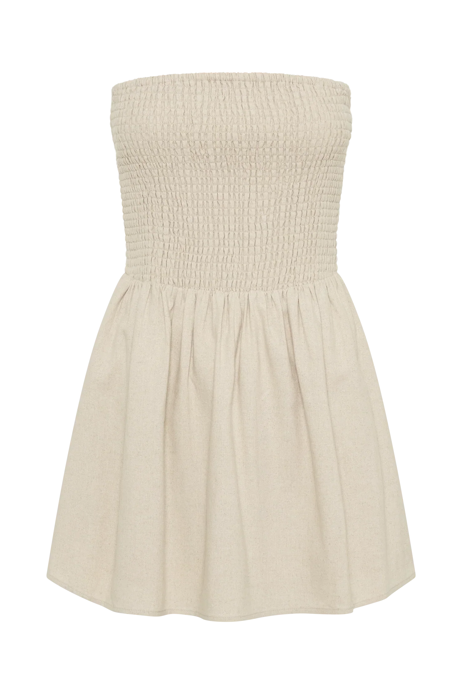 The HOLLAND is a linen mini dress designed with a shirred bodice that meets a gathered skirt, creating a playful silhouette.