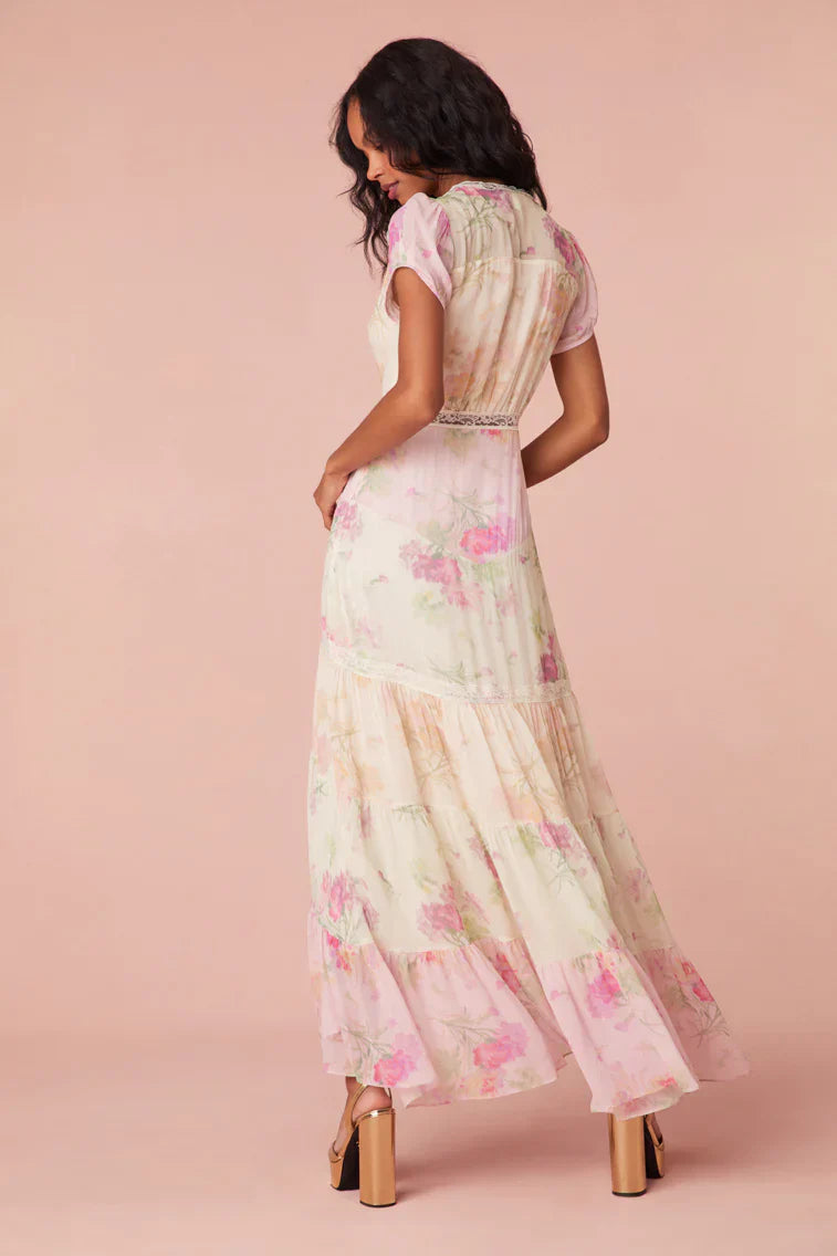 Ready for romance in the Roupell Dress. The stunning maxi arrives with a printed viscose rayon chiffon fabric featuring our large scale dreamy floral print mix in pink, cream, and a light green colorway. This sweeping dress begins with a v-neckline lined with lace and a lace-trimmed waist seam. The dress falls to a beautiful, flowy skirt.