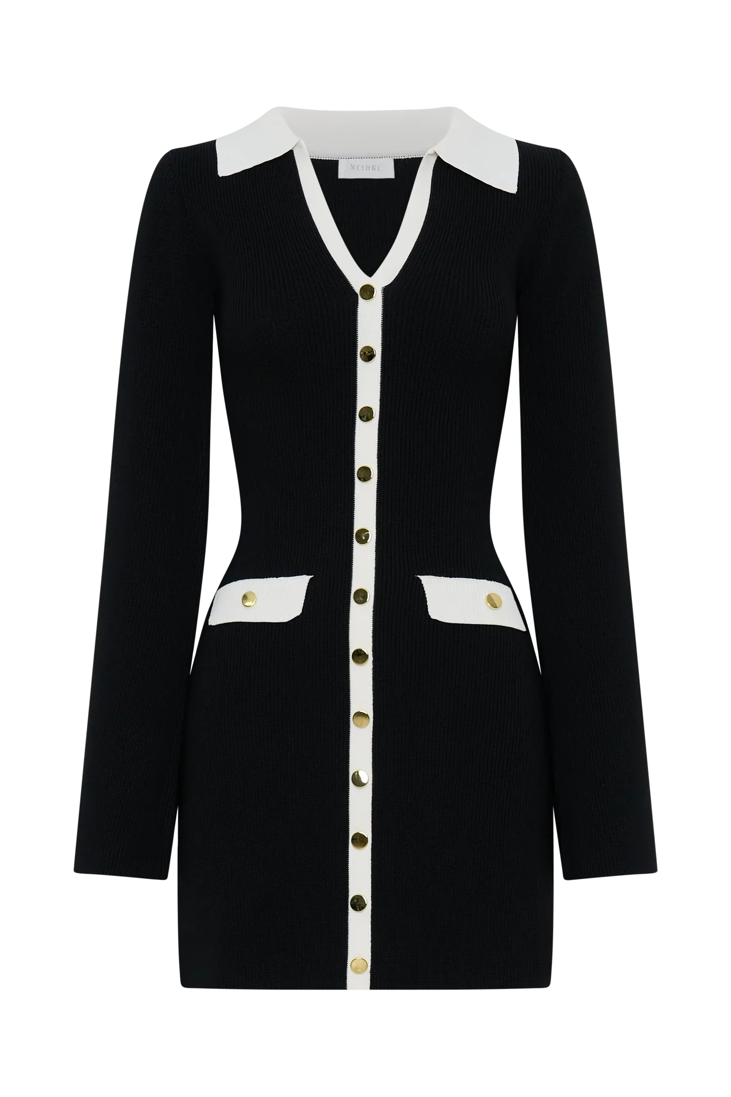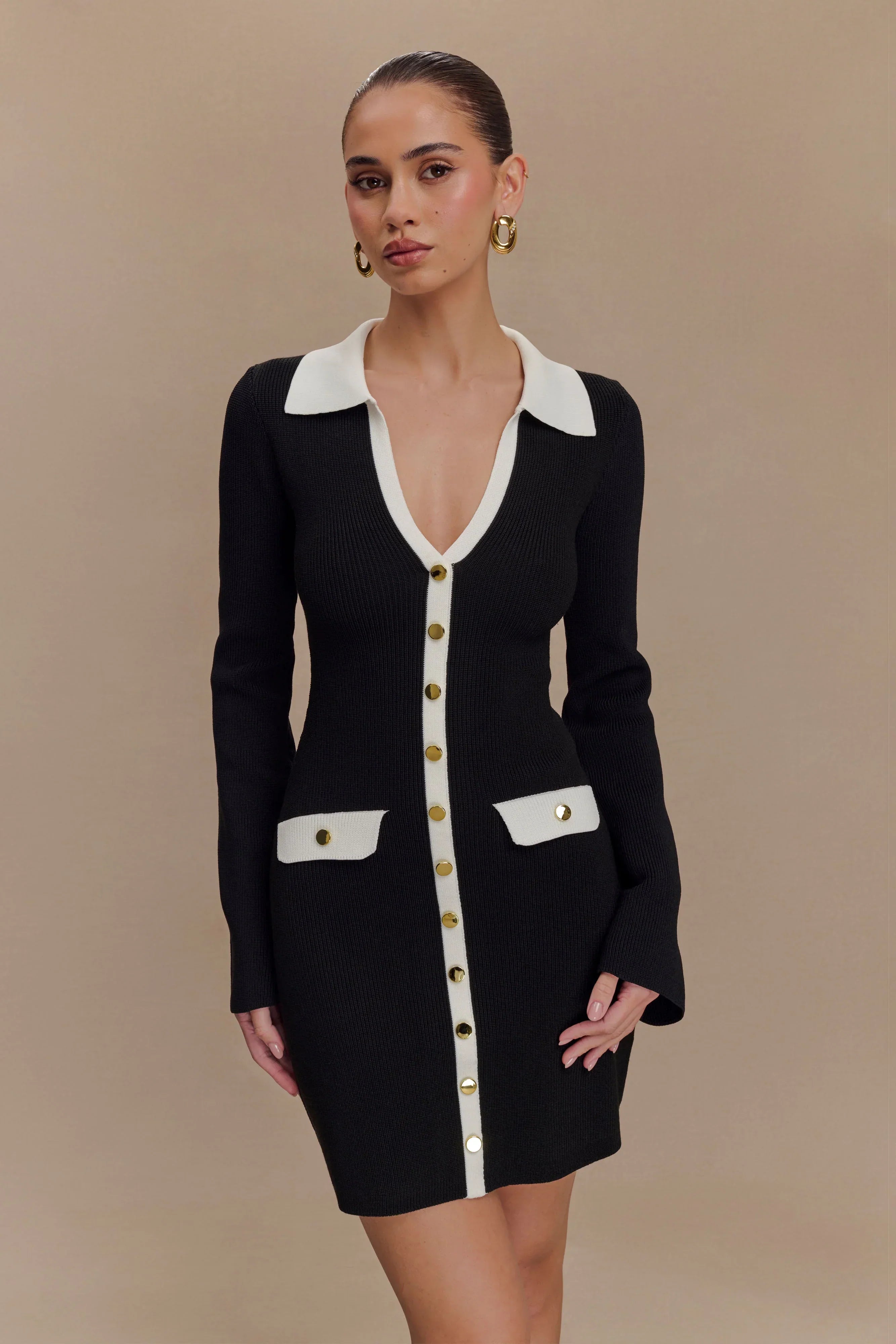Elevate your everyday wardrobe with the WRENLEY Long Sleeve Knit Mini Dress, a perfect blend of casual comfort and sophisticated style. Featuring a chic V-neckline with a collared detail, this dress exudes understated elegance. The ribbed knit fabric hugs your silhouette, offering a flattering fit, while the mini length adds a playful touch. Non-functional front buttons and pockets lend a polished, tailored look without compromising the streamlined design. Long sleeves make it versatile for any season, and the unlined knit ensures lightweight, breathable wear. Dress it up with heels or keep it casual with sneakers for a timeless, effortless look.